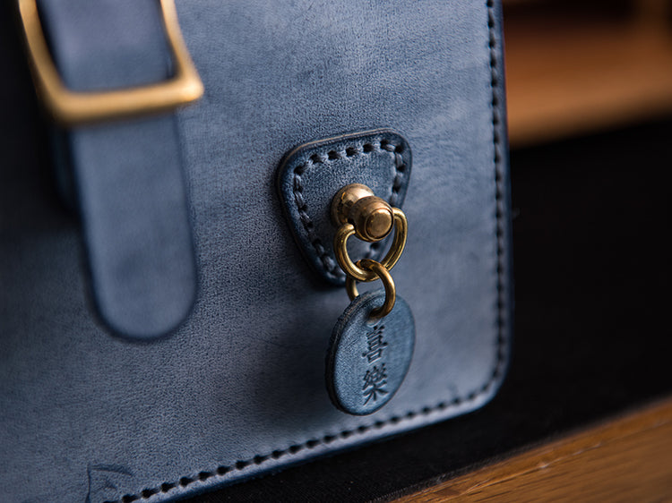 Fermeture sangle à boucle avec tirant style draw belt et garnitures métalliques inspirées des serrures d'atelier.